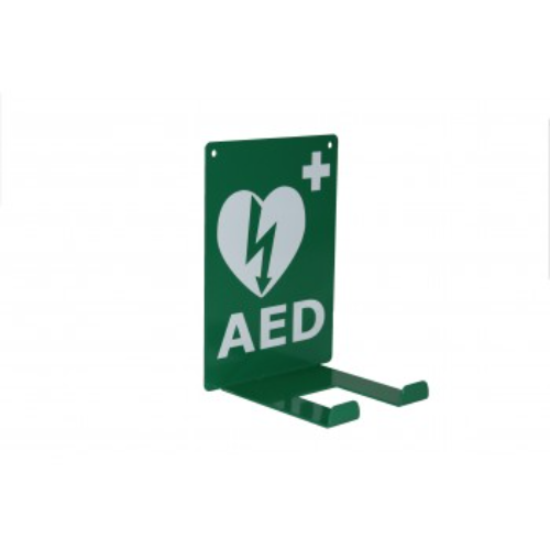 Universele stalen AED wandbeugel voorzien van het nieuwe internationale AED-logo.