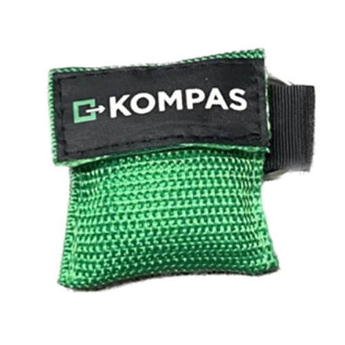 Sleutelhanger safe kiss klein met logo Kompas Veiligheidsgroep. Sleutelhanger met mondbeschermdoekje voor mond op mond beademing.