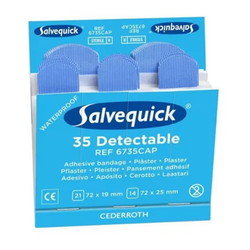 De navulset bestaat uit 35 detecteerbare pleisters in twee soorten maten voor in de Salvequick pleisterdispensers. De blauwe pleisters (HACCP) zijn speciaal bedoeld voor in de levensmiddelen industrie en zijn waterproof. De navulling kan gemakkelijk in de dispenser worden geklikt en zal niet meer loslaten. De pleisters zijn zeer gemakkelijk aan te brengen door het unieke Salvequick systeem. Wanneer de pleister uit de dispenser wordt getrokken laat de ene beschermende papierstrook los en kan de pleister met een enkele hand worden aangebracht.